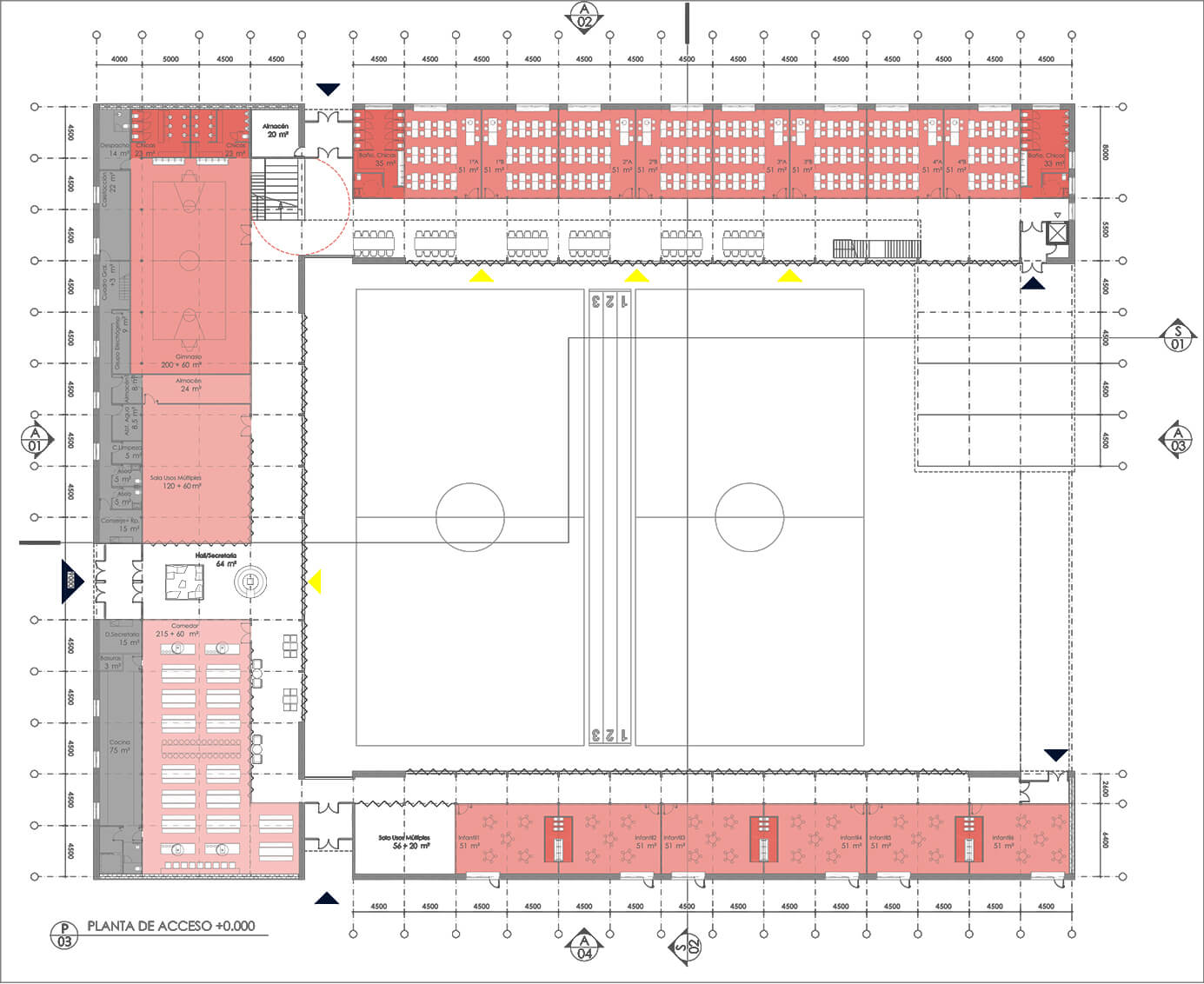 El edificio se desarrolla en su mayor parte en planta baja, siendo el centro del Colegio-patio las pistas deportivas y las zonas de recreo alrededor de las cuales se articulan los paquetes programáticos.
