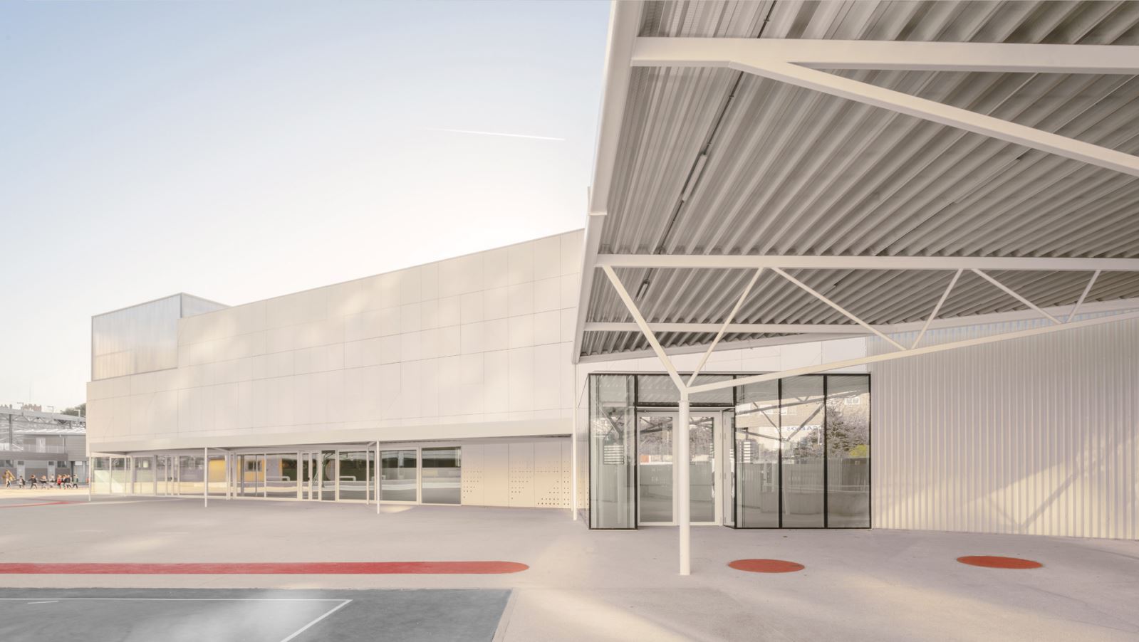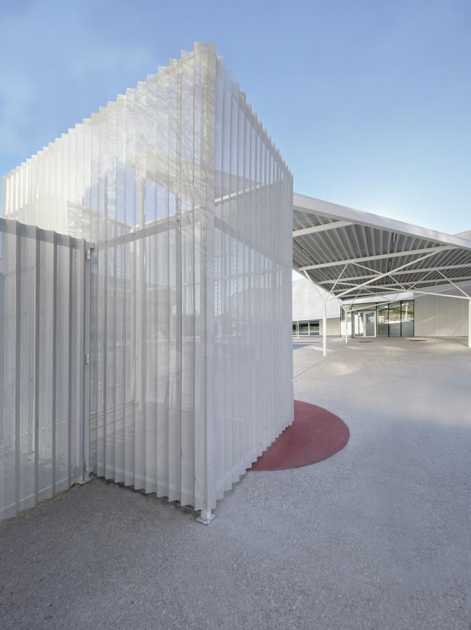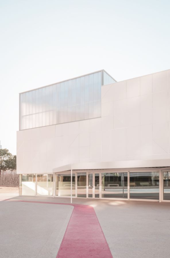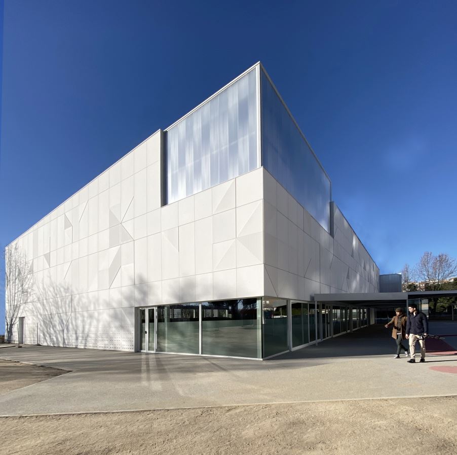 OAOB Arquitectura,  proyectó este pabellón polideportivo y sus espacios exteriores, se encuentra en Avenida de la Ilustración, frente a La Vaguada, pasa desapercibido camuflado entre el asfalto y la vegetación, arboles plataneros que arrojan sombras orgánicas sobre su fachada. Un edificio sencillo pero completo, bien implantado. Ubicado al suroeste de la parcela del colegio ya existente, la propuesta de Alejandro Cirugeda y Belén Valencia, se desarrolló en torno a dos conceptos clave: Maximizar el aprovechamiento de los espacios exteriores del colegio, utilizando el volumen del pabellón para re-configurar y mejorar el acceso al recinto.